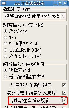 因為在【gcin注音/詞音設定】中,設定【詞音注音精簡視窗】被打鉤了