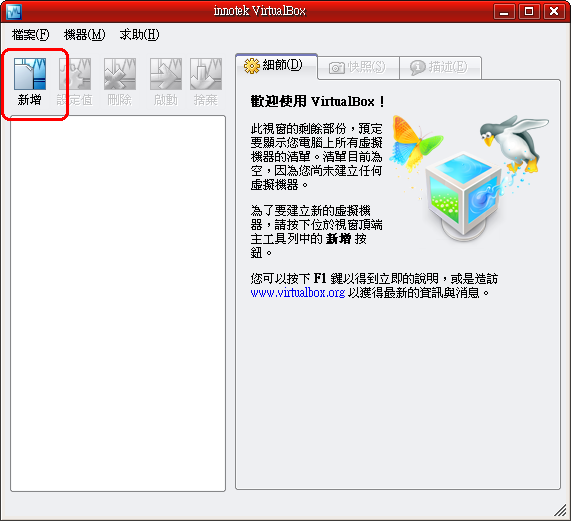 2.出現innotek VirtualBox畫面,按下新增