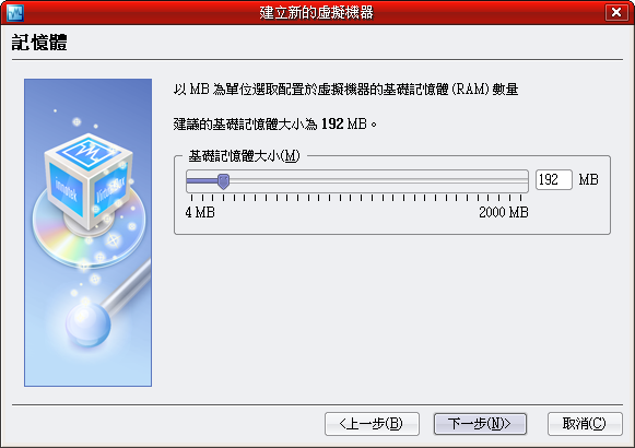 5.決定記憶體的大小(通常依預設值就夠了),再按下一步