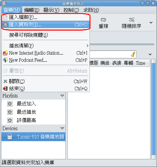 接下來就按音樂的【匯入檔案】或【匯入資料夾】就可以將音樂放到MP3 隨身聽內了。